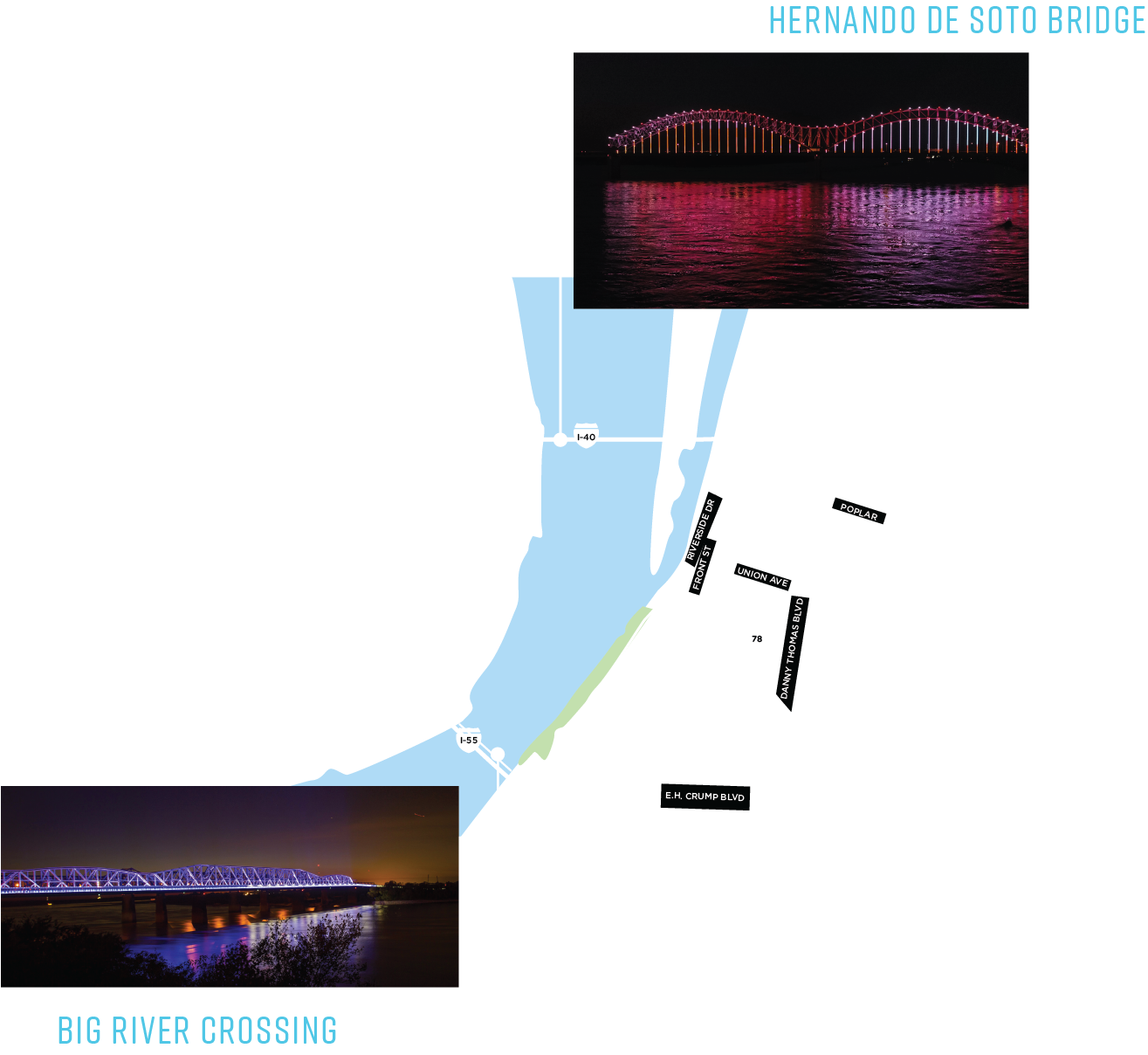 The lights can introduce millions of colors and pattern designs. They are synchronized and coordinated to achieve dramatic effects. The lights on Big River Crossing have introduced physical connectivity between Downtown Memphis and Arkansas, and the enhanced Hernando de Soto bridge lights visually connect Memphis’ mile-long riverfront. (The lights are directed outward from the roadways, however, so drivers on the de Soto Bridge are not affected.)